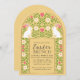 Hop into Easter with a brunch to remember! This invite features a charming arch-shaped frame filled with florals and playful white rabbits against a yellow background. Perfect for a festive gathering! Personalize it to meet your needs.
