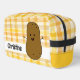 Bewundernswerte Kosmetiktüte mit einer niedlichen Cartoon braunen Kartoffel. Der Hintergrund ist ein niedliches, klassisches Muster von Gingham, einem Karo in Gelb und Weiß. Eine Vorlage, um Ihren Namen zu personalisieren.