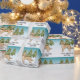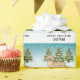 Desteis originelle Cartoon-Illustration eines niedlichen Golden Retriever Zuchthundes. Der Hund befindet sich in einer Winterlandschaft mit drei grünen Tannenbäumen. Der Hintergrund ist ein blaues bis weißes Gefälle, das das Design des kalten Wintertages verleiht. Es gibt einen personalisierbaren Textbereich, der jetzt lautet: "Frohe Weihnachten!" zusammen mit einem individuelle Name.