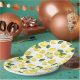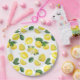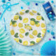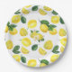 Teller mit niedlichem Zitronenmuster mit grünen Blätter und frisch geschnittenen Zitronenscheiben.
