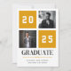 Feiern Sie den Meilenstein Ihres Absolventen mit dieser gelben, modernen Foto Collage Abschluss Ankündigung. Dieses Design besteht aus zwei Platzhaltern für Fotos und einem kühnen, variantenreichen Layout, in dem das Jahr hervorgehoben dargestellt wird. Passen Sie es mit dem Namen und der High School Ihres Absolventen an. Eine stilvolle und zeitgemäße Art, ihre Errungenschaften zu verkünden!