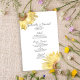 Customisez l'élégant menu Mariage Yellow Sunflower Watercolor avec les détails du repas que vous pourrez servir à votre jardin soirée inspiration déjeuner de douche nuptiale, fête de fiançailles, brunch mariage, dîner de répétition ou réception en ajoutant la salade ou le premier plat, entrée ou deuxième plat et dessert ou troisième plat. Personnalisez-le avec les noms de la mariée et du marié, le lieu de l'événement et la date de la cérémonie de mariage. Ce menu mariage à fleurs personnalisé et élégant présente une photo florale peinte en aquarelle numériquement des pétales de fleurs de tournesol jaune ornant les coins d'un arrière - plan blanc.