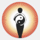 Yin Yang Figur mit rotem und goldenem Sonnenbrand. Abstrakte östliche Figur mit einem Yin-Yang-Symbol in Waffen, die kreisförmig angeordnet sind. Das Yin Yang Symbol hat den Platz des unsichtbaren Rollballs in einer Bewegung der Tai Chi Übungswölfe wie Wolken eingenommen.