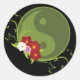 Vor diesem großen, zweifarbigen Yin Yang-Symbol mit grünen Blätter und dünnen, weichen Blumenelementen liegt eine Mischung aus roten, rosa und weißen Blume! Gutes Geschenk für Yogafreunde sowie buddhistische und asiatische Religionsanhänger!