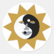 Eine goldene Sonne mit dem Gesicht auf einem schwarz-weißen Gelenk auf einem Aufkleber