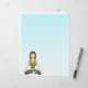 Stilvolle Vektor-Illustration einer schönen brünetten Frau, die Yoga macht. Die Frau sitzt in traditioneller Lotus-Position. Sie trägt ein grünes Panzeroberteil und eine dunkelgraue Hose. Der Hintergrund ist ein schöner blauer Verlauf.