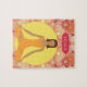 Eine Frau mit dem braunen Haar in einer Yoga-Pose mit positiver Energie und dem Wort "Yoga" oben