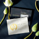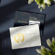 Yoga Studio Meditation Instructor / Life Coach / Healer / Reiki Master / Massage Therapy 10 Class Pass Loyalty Card Template - Elegante Calligraphy Imitate Gold Foil Yoga Meditation Leichte Pose / Sukhasana Pose mit ZEN Symbol auf OM Symbol White Paper Background.