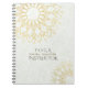 YOGA Meditation Instructor Notebook Vorlage - Elegante Imitate Gold Foil Mandala Symbole auf floralen Damasketpapier Hintergrund.