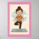 Diese Cartoon-Abbildung zeigt eine junge Frau, die die Pose Baum (Vrikshasana), eine beliebte Yoga-Asana, anmutig darstellend hat, die für die Förderung von Ausgewogenheit und Fokus bekannt ist. Sie steht selbstbewusst auf einem Bein auf einer weichen, blauen Yoga-Matte, wobei ihr anderer Fuß sanft gegen ihren inneren Oberschenkel ruht. Ihre Hände sind an ihrer Brust in einer Gebetsposition verbunden, und ihre Augen sind in ruhiger Konzentration geschlossen. Sie trägt einen fröhlichen orangefarbenen T - Shirt, gepaart mit einer schwarzen Yoga Hose, und ihr Haar ist ordentlich in einem Knochen gefesselt. Der Hintergrund ist ruhig und minimalistisch, mit weichen Wolken und einem pastellförmigen, runden Hintergrund, der ihre friedliche Energie und meditative Haltung unterstreicht. Dieses bezaubernde Kunstwerk im Stil eines Cartoon besticht durch sein Wesen von Achtsamkeit und innerer Harmonie. Sieht gut aus in einem Wandplakat.