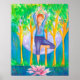 Ein hübsches Poster mit einer friedlichen Frau in einer Yoga-Haltung in einer Baum-Pose mit einer hellrosa Lotus-Blume in einem Teich, Bäumen und großen lila Vollmond mit Aquarell bemalt.