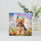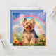 Eine personalisierte Yorkshire Terrier Yorkie-Gedenkkarte mit einem wunderschönen Bild eines Yorkshire Terrier auf einem himmlischen Hügel mit einer wunderschönen Regenbogenwand. Die Symbolisierung des Yorkshire Terrier Hundes hat die Regenbogenbrücke an den Hundehaufen übergeben. Sie können ihn mit Ihrem eigenen Yorkshire Terrier Hundenamen oder mit jedem anderen Text auf der Rückseite der Karte personalisieren. Macht ein besonderes Denkmal oder Beileid Geschenk für jeden Yorkie-Hundeliebhaber, wenn sein lieber Hund vorbei ist.