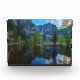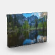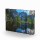 Ein ruhiges Landschaftsfoto erfasst die majestätischen Yosemite Falls, die eine mächtige Granitklippe hinabragen. Das Wasser fällt in einen ruhigen Merced Fluss, dessen Oberfläche die umliegende Landschaft widerspiegelt, darunter die üppig grünen Bäume, die die Ufer und die dramatischen Felsformationen umsäumen. Der Himmel oben ist ein sanftes Blau, dessen weiße Wolken die friedliche Atmosphäre verstärken.