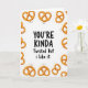 This card shows a funny, affectionate message surrounded by a border of golden-brown pretzels. In the center, on a white background, the text reads “YOU’RE KINDA Twisted But i Like it” in black, simple sans-serif letters. The words sit right in the middle, with plenty of space around them so the message is easy to read. Around the edges, pretzels appear whole and partly cut off, as if there are more just outside the frame. Each pretzel looks toasted and slightly textured, with little white salt bits scattered on top and sizes that vary a bit. A few small gray bracket-like marks sit near some pretzels, adding a small graphic detail without distracting from the main joke. It feels meaningful because it’s a sweet way to say “I like you as you are,” with a little teasing that can fit romance or close friendship 🥰❤️.