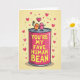 This greeting card shows a bright pink tin can in the center with two cute bean-shaped characters sitting on its rim. One bean is orange and smiling, and it holds up a small bouquet of pink and yellow flowers toward a rosy pink bean that smiles back. Both characters have simple dot eyes and wide, happy grins that make the moment feel sweet and friendly. On the front of the can, the message “YOU’RE MY FAVE HUMAN BEAN” appears in yellow block letters that are easy to read. A large magenta heart floats above them, and the background is a soft yellow with scattered small magenta hearts and little yellow stars. The overall setting feels like a simple, cheerful Valentine scene with a fun pun at the center ❤️