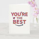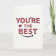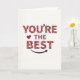 This greeting card features the message “YOU’RE THE BEST” in big, block letters that fill most of the front. “YOU’RE” sits across the top, “THE” is smaller in the middle, and “BEST” stretches along the bottom. The letters are packed with tiny confetti-like shapes in magenta, deep plum, orange, and teal, with little squares, triangles, and star bits sprinkled throughout. A small plum heart sits right next to the word “THE,” adding a sweet touch ❤️. Under the word “BEST,” there’s a dark indigo arrow that curves upward like a friendly underline, pointing the message forward. The background is plain white, so the colors and shapes in the lettering stand out right away 💌
