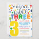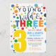 Fêtez le grand jour de votre petit aventurier avec notre 3e Invitation d’anniversaire "Jeune, sauvage et trois" ! Ce design ludique présente des couleurs primaires audacieuses et des pois gais, créant une ambiance ludique et animée, parfaite pour une fête pour enfants. Le style rétro-moderne convient parfaitement aux garçons, aux filles ou aux célébrations sans distinction de genre, ce qui en fait l'endroit idéal pour un anniversaire de naissance, un thème de cirque ou un bain de couleur primaire.