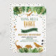 Diese bezaubernde Geburtstagseinladung enthält tropische Aquarellfarben-Blätter mit Imitaten, Goldfolienblättern, Golddinosaurier-Silhouetten und Konfetti.