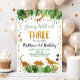 Diese bezaubernde Geburtstagseinladung beinhaltet tropische Aquarellfarben-Blätter mit Goldfolienschmuck und Golddinosaurier-Silhouetten.