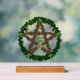 Une étoile de pinecones encerclée par une couronne d'épicéas, parsemée de saints et surmontée d'un arc en or, se rassemblant avec une paire de fées de yuletide pour souhaiter à tous un Yule béni.
