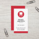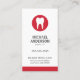 Moderne und elegante, vertikale Visitenkarte für Zahnarzt oder Zahnarztassistent mit einem weißen Zahnlogo auf einem roten Kreis. Personalisierbarer Name, Titel / Firmenname und Kontaktinformationen auf der Vorderseite. Rot zurück. Schöne Visitenkarte für alle, die mit Zahn oder Zahnpflege arbeiten.