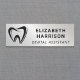 Moderne berufliche silberne Imitate Metallmarke für Zahnärzte, Zahnärzte, Hygieneservice und andere Mitglieder eines Zahnarztes. Behalt das Zahnlogo oder ersetze es durch dein Logo. Fügen Sie einen Namen und Titel in einfacher Typografie hinzu.