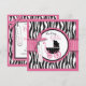 Empreinte zébrée sauvage et sucrée aux accents roses chauds et poupée de bébé poitrine de polka avec étiquette 3D, archet et trims carte d'invitation pour baby shower de petite fille.
