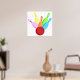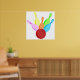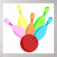 Einfache Veranschaulichung der farbenfrohen 10-Button-Bowling-Skittles, die von einem Bowlingball niedergeschlagen werden. Bilder auf verschiedenen Geschenken und Produkten erhältlich. Poster. Drucke.