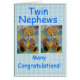 Zwei niedlichen kleine Teddies mit blauen Bögen auf Gingham Hintergrund und der Text Twin nephews Vielen Glückwunsch!