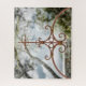 Detailfoto des schmiedeeisernen Kreuzes mit weichen Fokusbäumen und subtilem blauen Himmel dahinter. Intricate Design und starke Symbolik an der Mission Espada, in San Antonio, Texas.
