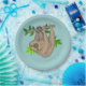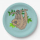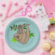 Ein niedlicher zeichn eines braunen Faultiers, der an einem Ast mit Blätter klammert und auf dem Kopf hängt. Retro den grünen Hintergrund.