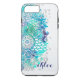 Kundengebundener iPhone 7 Fall: Lacy aquamarines und blaues Blumenmandala-Muster/subtiler Sahnehintergrund-personalisierte moderne Namenstypographie