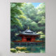 Die Schönheit eines japanischen Tempels, der sich friedlich in der Mitte eines ruhigen Teiches ruht, kann man in diesem digitalen Kunstwerk sehen. Ein schöner Ausblick entsteht durch den dichten, grünen Wald dahinter und den Himmel darüber. Ein Blick auf ein ruhiges Universum, das außerhalb unserer Reichweite liegt, wird durch die Reflektionen des Tempels und der umliegenden Landschaft im ruhigen Wasser des Sees geboten. Die ausgeklügelten architektonischen Elemente des Tempels und das ruhige Ambiente der Umgebung bringen uns zu einem Ort, wo der Frieden herrscht.