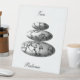 Ein einfaches, sauberes, ästhetisches Zen-Design aus drei glatten, ovalen Steinen, die in einem vertikalen Stapel angeordnet sind, mit dem größten Stein am Boden, einem mittelgroßen Stein in der Mitte und dem kleinsten Stein an der Spitze, was ein Bild von perfekter Zen-Balance schafft.