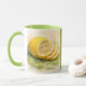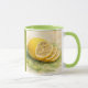 A watercolour lemon partially sliced to reveal music-paper segments, resting on a loose green leaf with shimmering juice droplets. A fresh, natural still life blending citrus brightness with musical harmony.