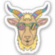 Ein skurriler und stilvoller Ziegenkopfaufkleber mit einer stilisierten Ziege aus Cartoon mit einem schelhaften Grinsen. Die Ziege hat eine Retro-Aviator-Sonnenbrille und ein buntes, multigemustertes Headband. Das Design ist auffällig und spielerisch, ideal für die Dekoration von Notebooks, Laptops oder anderen persönlichen Gegenständen.