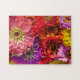 Ein Blumenstrauß mit roten, orangefarbenen, gelben, magentafarbenen und lachsfarbenen Zinnia-Blüten.