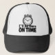Das Design hat ein Lügenziffer "Ich bin pünktlich da". Man könnte sich vorstellen, dass dies in einem humorvollen Rahmen verwendet wird, z. B. auf einem T - Shirt, einer Tasse oder einem Poster. Diese Art von Design spielt auf der universellen Erfahrung von Menschen, die gewöhnlich zu spät sind, und macht es relativierbar und lustig.