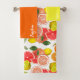 Dieses Badehandtuch-Set hat ein Zitrusdesign in den Farben Zitrone, Grün und Orange. Es handelt sich um ein passendes Set aus Badehandtüchern mit einem frischen, lebendigen Zitrusthema, hergestellt aus saugfähigem Material zum Abtrocknen.