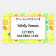 Ein Aufkleber mit essbaren Backwaren oder Konserven mit farbigen Zitrusfrüchtemustern aus Zitronen, Limetten, Orangen und Zitrusfrüchten auf Plätzen aus Weiß, Orange, aquamarin und Gelb, für Marmelade, Gelees oder andere Rezepte.
