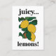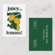 Lemon Citrus Fruit Business Card Original Design von Nisha Prabhu. Vollständig anpassbar. Personalisieren Sie Ihre Daten. Erleben Sie einen fruchtigen und erfrischenden ersten Eindruck mit unserer lebendigen "Lemon Citrus Fruit Business Card"! Dieses auffallende Design ist perfekt für Unternehmer, Kreative oder alle in der Lebensmittel- und Getränkeindustrie. Es zeichnet sich durch eine lebendige Zitronengrafik aus, die Frische und Frische verkörpert. Lassen Sie sich von der Masse abheben und ließe Sie Ihre Persönlichkeit mit dieser einzigartigen Visitenkarte durch! Die helle Zitronenillustrierung sorgt für eine lustige und fröhliche Touch, die Ihre Karte unvergesslich und sofort erkennbar macht. Erhöhen Sie Ihr Netzwerkspiel mit der Lemon Citrus Fruit Business Card! Ob Sie an Messen, Kundenmeetings oder lässigen Treffen teilnehmen, diese Karte wird sicher Aufmerksamkeit erlangen und Gespräche auslösen.