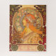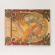 Alphonse Mucha - Zodiac, 1896. In dieser Komposition nahm Mucha zwölf zodiakische Zeichen in die halo-ähnliche Scheibe hinter dem Kopf der Frau ein, eines von Muchas gewohnten Motiven. Die majestätische Schönheit der Frau wird durch ihr regales tragen und ihren aufwändigen Schmuck unterstrichen. Alfons Maria Mucha (1860-1939), international bekannt als Alphonse Mucha, war ein tschechischer Maler, Illustrator und Grafiker. Er lebte während der Jugendstil-Zeit in Paris und war weithin bekannt für seine ausgesprochen stilisierten und dekorativen Theaterplakate, insbesondere die von Sarah Bernhardt. Er produzierte Illustrationen, Werbung, dekorative Tafeln sowie Designs, die zu den bekanntesten Bildern der Zeit gehörten.