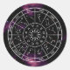 Elegante, kreisförmige Aufkleber mit einem zodiaktischen Kalender mit dunklem Nachthimmel und schönem lila Nebel-Hintergrund. Der zodiale Kreis zeigt alle 12 Sternzeichen und Sternbilder der Astrologie.