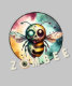This design features a horror-themed fantasy illustration of a bee reimaged as a zombie, aptly titled "Zombee". The bee has large, exaggerated eyes with one appearing to be popping out, and its mouth agape with a trickle of blood, enhancing its undead appearance. It showcases a detailed and vibrant water color style with a blend of chaud and cool tones in the background, creating a striking contrast with the creature. The play on words in the title adds of dark humor to this eerie yet captivating artwork.