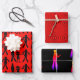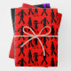 Zombie Packpapier Blatt. Rot und Schwarz mit Bildern von Toten, die in Silhouette laufen, sind auf einem Blatt. Eines ist ein rotes Sternexplosion-Muster, das dritte ist schwarz, mit Zombie-Muster in leuchtenden Farben. Ideal für die Verpackung von Geschenken für einen Horror zum Thema Geburtstag oder Veranstaltung.