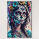 Treten Sie ein in eine Welt, in der Tradition und Modernität mit diesem fesselnden Bild einer Frau, die ein Zuckerschädelstich macht, zusammenkommen. Ihr Gesicht, eine Leinwand von lebhaften Farben und Blumenmustern, spiegelt den festlichen Geist von Día de los Muertos wider. Sie ist mit einem Blumenkopfteil und einem Schädelanhänger geschmückt und verkörpert die Verschmelzung von alten Bräuchen und zeitgenössischer Mode mit einem lebendigen städtischen Tableau.