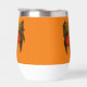 Eine braune, große Hornkeule mit einem Tag des toten Zuckerschädels und rote Rosen in einem orangefarbenen Hintergrund.