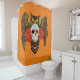 Eine braune große Hornkeule mit einem Tag des toten Zuckerschädels und rote Rosen in einem Hintergrund von Orange.