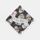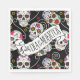 Eine farbenfrohe Papierserviette für den Tag der Toten Feierlichkeiten, die eine Vielzahl dekorativer Zuckerschädel mit Blume und schwirl Akzenten auf einem optionalen schwarzen Hintergrund aufweist. Falls gewünscht, können Banner und Textschicht von "Feliz Dia de los Muertos" gelöscht werden, um dieses Design für andere Gelegenheiten zu verwenden. Suchen Sie ID725 um andere Farbauswahl und Produkte mit diesem lustigen Muster zu sehen.