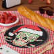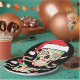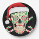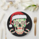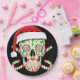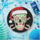 Ein Weihnachtsthemed Zuckerschädel mit einer Weihnachtsmannmütze, Pfefferminzaugen und Zuckerstangegekreuzten knochen auf einem schwarzen Hintergrund.